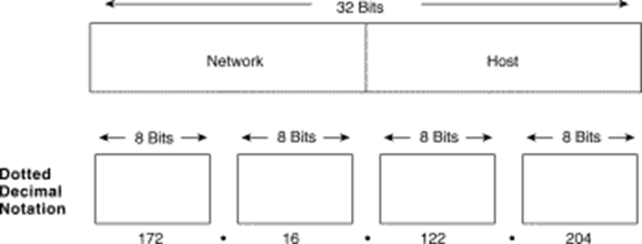 Địa chỉ IP có thể được biểu diễn dưới dạng mã nhị phân 32 bit bao gồm bốn nhóm 8 bit như hình trên (hoặc bình thường thì được biểu diễn dưới dạng thập phân: cứ 8 bit được quy đổi ra một số thập phân, các số thập phân cách nhau bởi dấu chấm). 32 bit này được chia thành hai phần (từ trái qua phải):